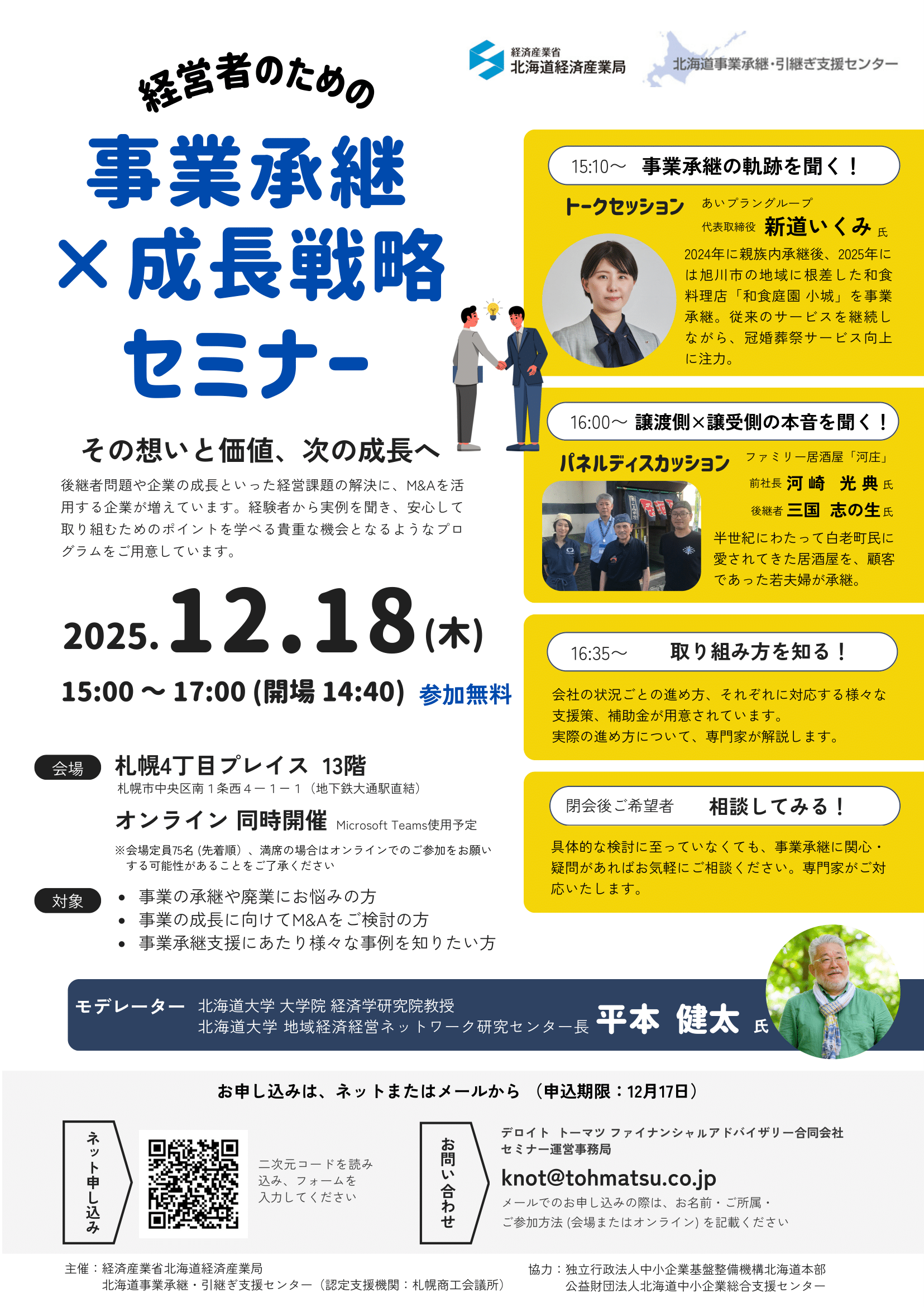 経済産業省北海道経済産業局は、M&Aの普及促進を図るため、『経営者のための事業承継×成長戦略セミナー』を開催します。