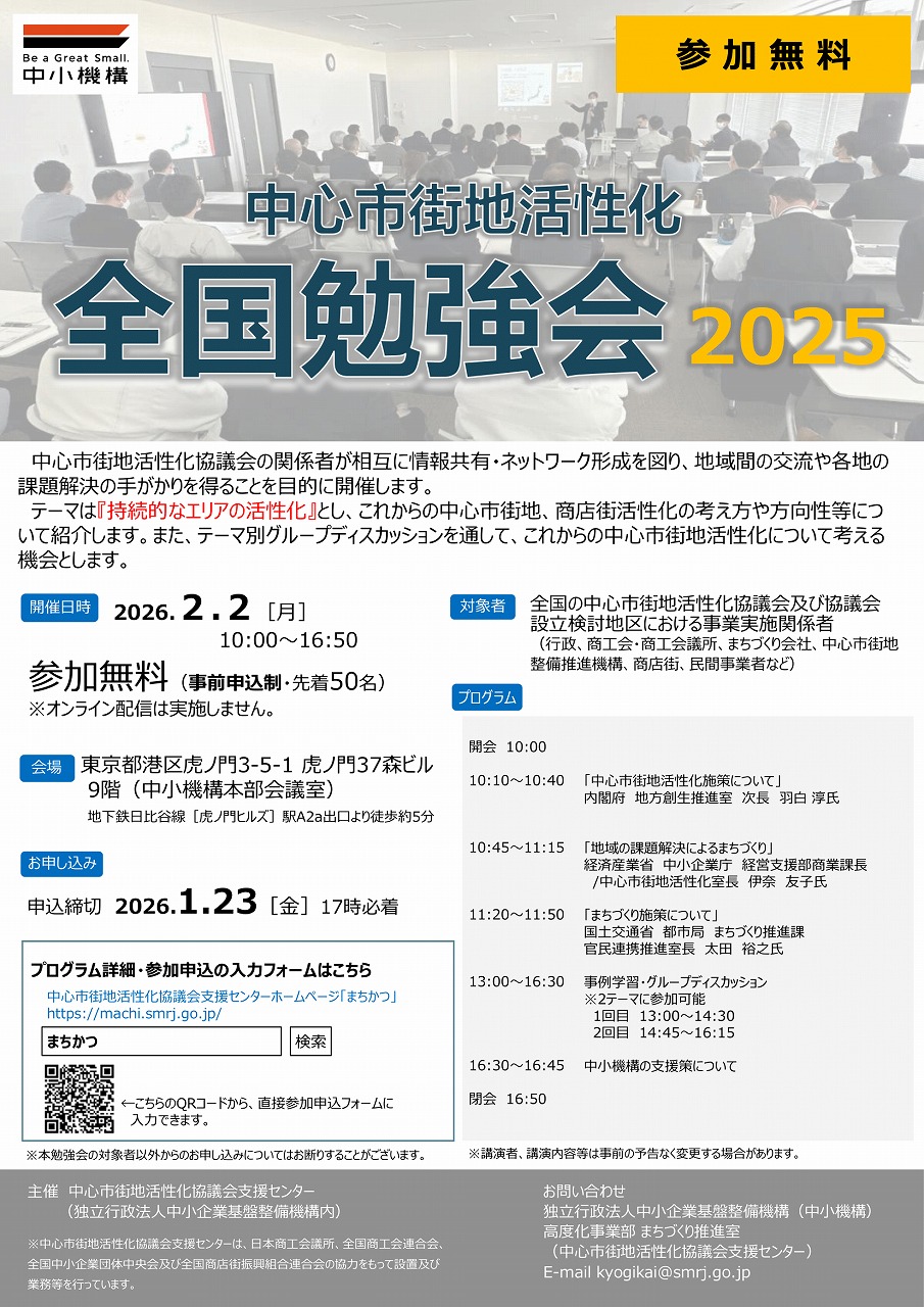 中心市街地活性化協議会支援センターは、中心市街地活性化協議会の関係者が相互に情報共有・ネットワーク形成を図り、地域間の交流や各地の課題解決の手がかりを得ることを目的として、「中心市街地活性化 全国勉強会2025」を開催します。