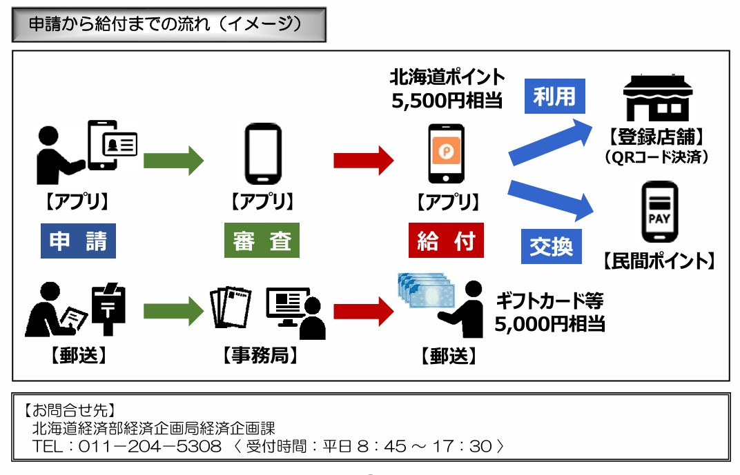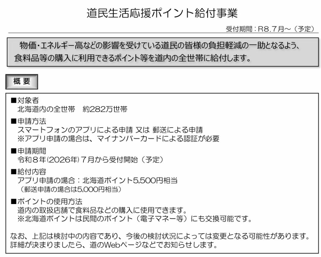 本事業では、北海道内の全世帯(約282万世帯)を対象に、食品等の購入に利用できるポイントが給付されます。