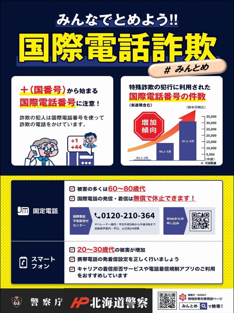 皆さまにおかれましては、「警察庁推奨アプリ」の活用や国際電話の利用休止など、特殊詐欺被害防止に向けた取組の普及にご協力をお願いいたします。
