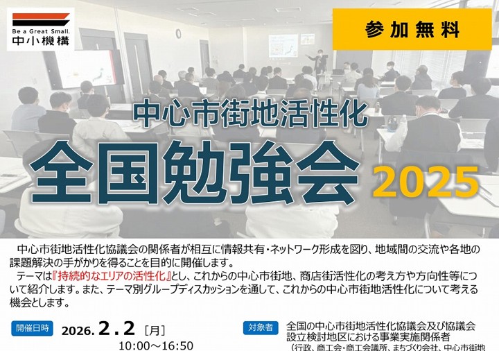 中心市街地活性化協議会支援センターは、中心市街地活性化協議会の関係者が相互に情報共有・ネットワーク形成を図り、地域間の交流や各地の課題解決の手がかりを得ることを目的として、「中心市街地活性化 全国勉強会2025」を開催します。【日時】2026年... -